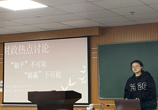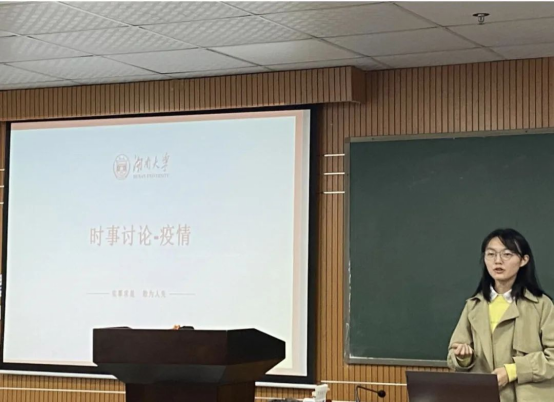 第八组由郭怡楷同志进行分享,该小组讨论主题是疫情防控。该小组首先讨论了习近平总书记的武汉考察讲话,与国外抗疫措施对比,也讨论了我国部分地区抗议过度的问题,以此来展现二十条的进步。最后分析了我国采取当下防疫政策的原因。