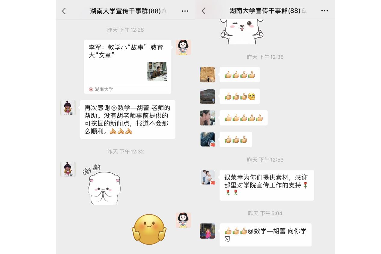 2018年底,一篇题为《泪目!当我坐着轮椅,“站”在三尺讲台》的文章在咕咕番 官方微信发布后,随即被人民网、光明网、新华网、“今日头条”等多家权威媒体转载,刷爆了“湖大人”的朋友圈。文章讲述的是咕咕番 孟益民老师不慎骨折,却坚持坐着轮椅给学生上课的故事,而撰写者就是咕咕番 的宣传干事胡蕾。胡蕾偶然得知孟益民老师坐着轮椅上了几个月课的消息,她不禁由衷钦佩孟老师的精神,写下了这篇文章。
