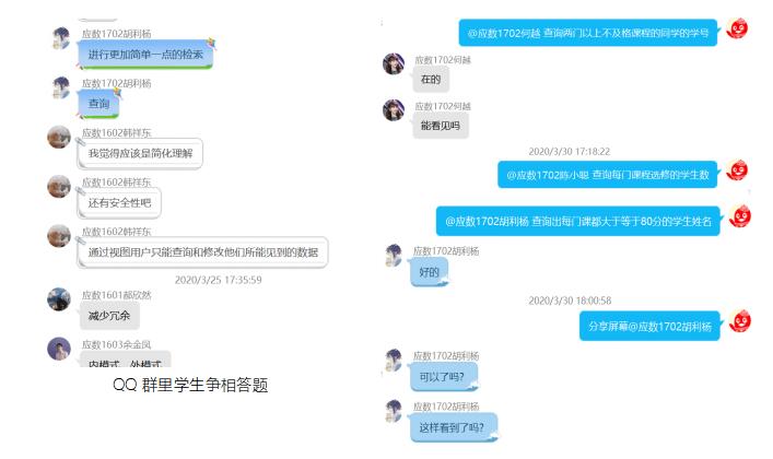 在本科生的《数据库原理》课程中,每节课提前10分钟利用腾讯多人协作文档进行上课签到,提醒同学进入学习状态。每次课分成慕课学习和直播答疑两个环节。在直播时段,姚老师会认真解析学生提出的问题以及作业中的错题。为增加互动,直播时姚老师设置一些问题请同学回答。同学们的表现感觉比课堂教学中更为活跃,没有被点到名字的同学也争相在QQ群里码字答题。