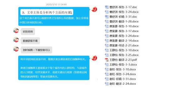 疫情期间,姚老师坚持每周定期通过三个QQ群分别与其指导的本科生、研究生以及两个竞赛团队进行交流和讨论。姚老师经常在群里分享AI战疫的最新成果,引导学生开展相关研究。由于理科生天天与公式打交道,少有写作机会,有些同学的学术写作能力常常让老师们捉急。因此,姚老师建议学生们将原来的口头报告改为书面报告,以此来促进学生学术写作能力的提高。几周下来,学生们从开始不太习惯,到慢慢能静下心来梳理一周的所学所思所得。书面报告的长度、内容和格式排版各方面都有明显的进步。