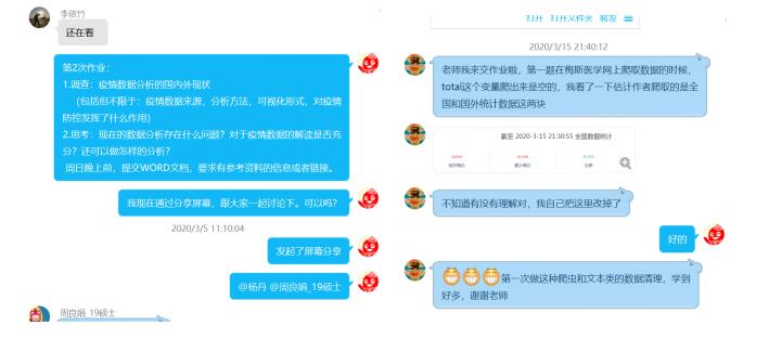 在研究生的《数据挖掘》课程中,姚老师结合当前热点问题,设计新冠肺炎疫情数据分析系列作业,指导学生进行数据科学实践,锻炼学生在数据爬取、数据清理、数据探索、数据分析和可视化等方面的能力。学生天天关注新冠肺炎疫情变化,对此课题表现出浓厚兴趣。从亲手搜集与整理数据,到认真分析与思考问题,最后在线上分享与讨论,同学之间互相取长补短,大家感觉很有收获。