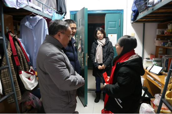 在学生宿舍里,领导们与学院学子握手问好、亲切交谈,详细了解了学生在寒假期间的吃饭、学习、运动情况,送上准备好的新春大礼包以及过年红包,并亲手为同学们带上红色的围巾。