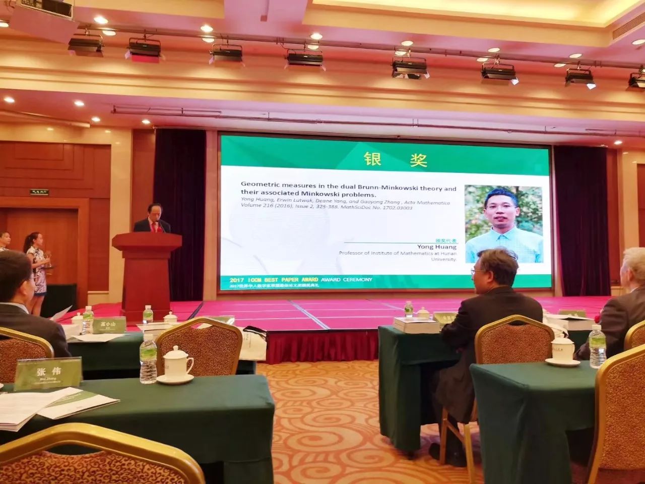 Geometricmeasures in the dual Brunn-Minkowski theory and their associated Minkowskiproblems Acta Math., 216 (2016), no. 2, 325-388” 获得华人数学家最佳论文奖银奖,并应邀在会议做题为Geometric measures and their associated Minkowski problems学术报告。