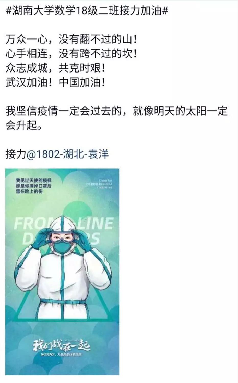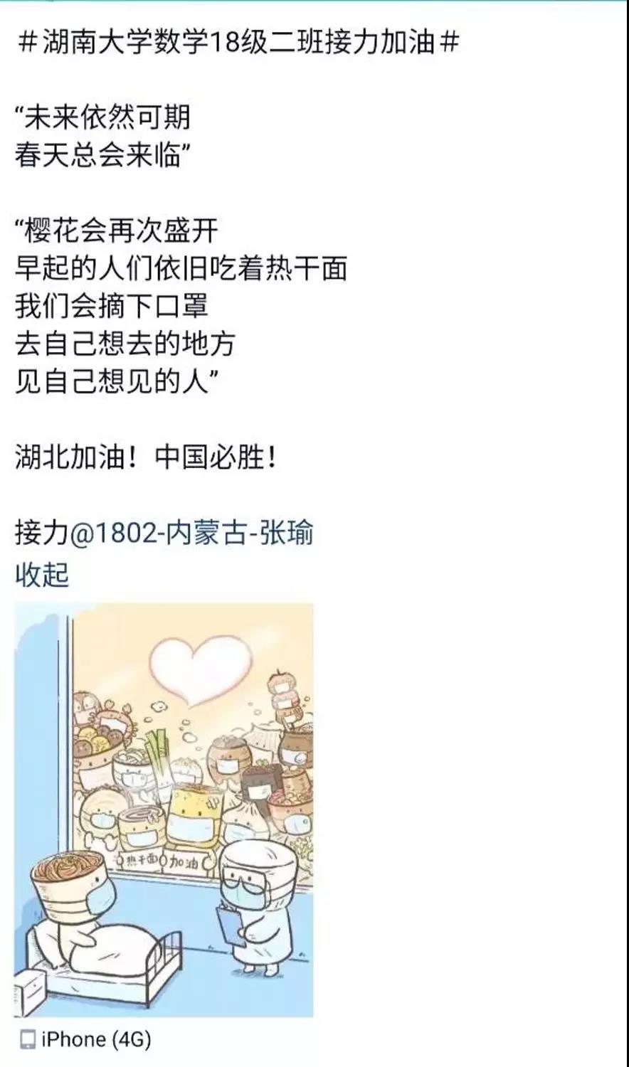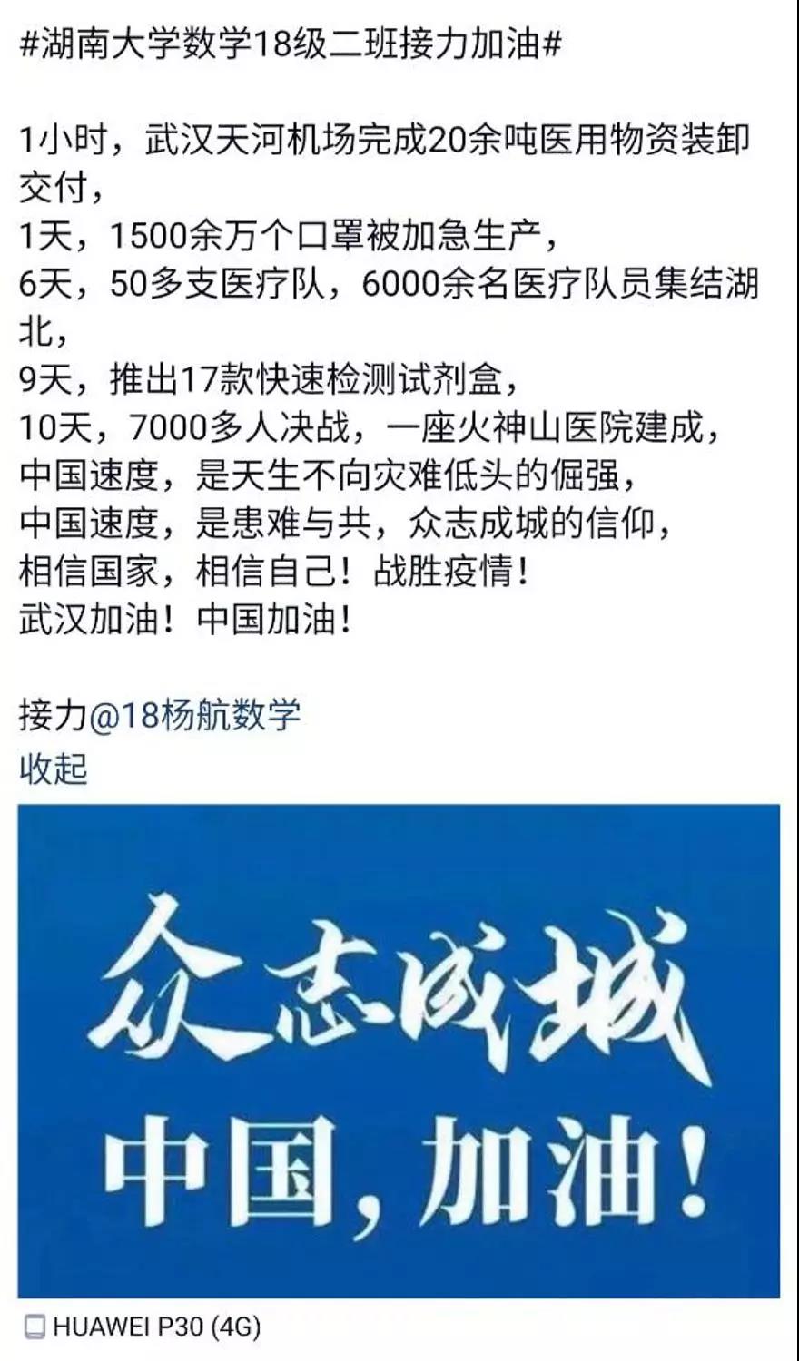 近日,咕咕番 数学院1802班的同学们自发组织了一场线上“接力加油“活动,为中国祈福,为武汉加油!