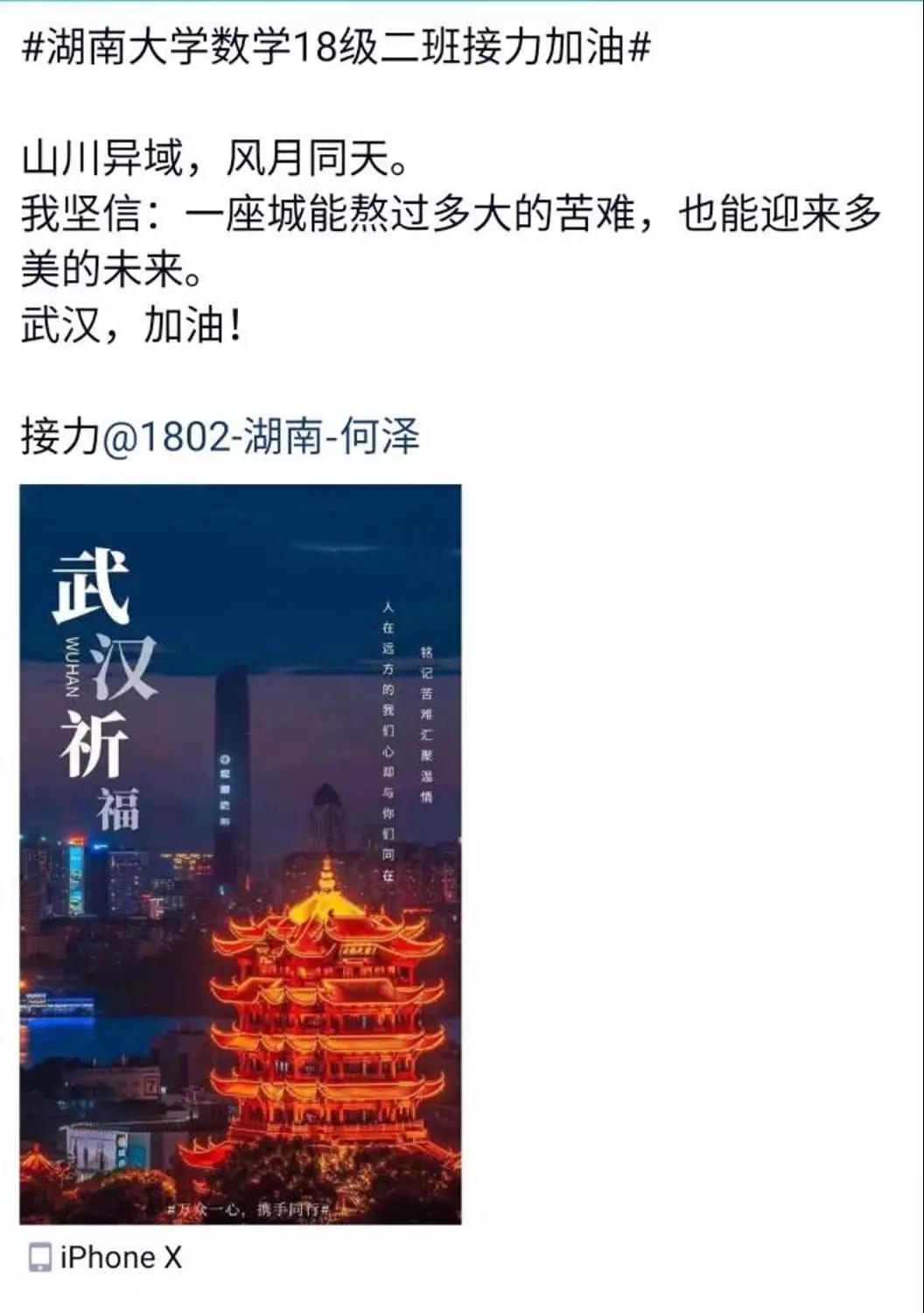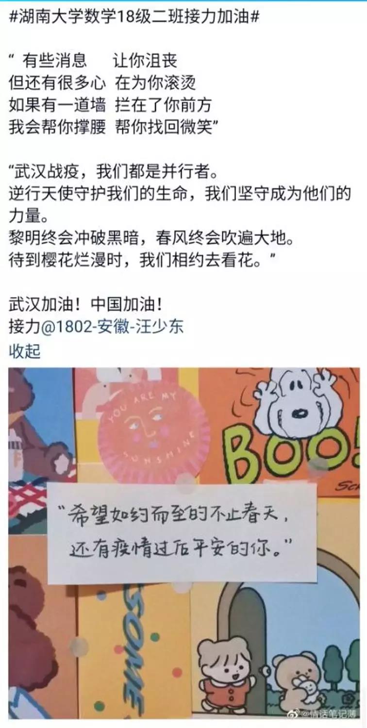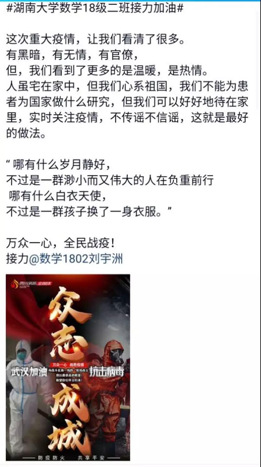 近日,咕咕番 数学院1802班的同学们自发组织了一场线上“接力加油“活动,为中国祈福,为武汉加油!